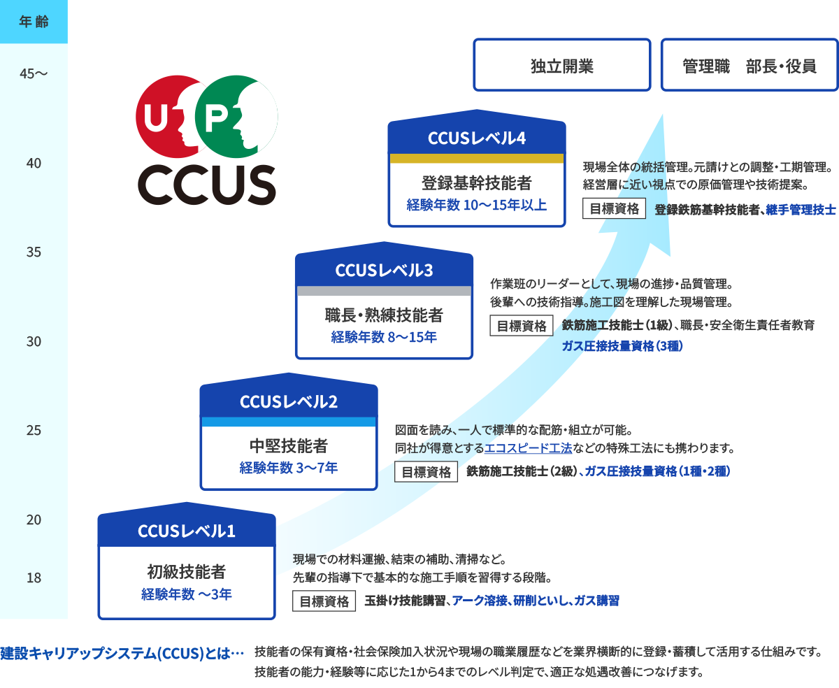 | 多能工としての価値 | 鉄筋の「組立」だけでなく「加工」や「圧接」まで一貫して経験できるため、建設キャリアップシステム(CCUS)上の評価が多角的に蓄積されます。 |